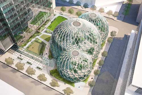 Công trình giống như sản phẩm của tương lai, thể hiện sự yêu thích môn khoa học viễn tưởng của Jeff Bezos, nhà sáng lập Amazon.com. Trong ảnh là phối cảnh tòa nhà giữa các cao ốc ở Seattle.