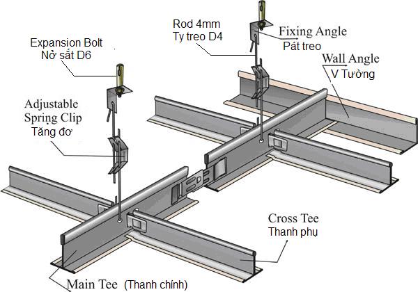 Thanh chính: là thanh chịu lực chính được treo lên trần bằng các cụm ty treo hoặc tăng đơ. Thanh phụ: được liên kết với thanh chính và tiếp xúc trực tiếp với tấm trần. Thanh viền: Là thanh được liên kết giữa tường hoặc vách với thanh chính và phụ. Tấm thạch cao: Các tấm trần sẽ được liên kết với các thanh chính, phụ và thanh viền tường phủ hệ khung xương tạo thành bề mặt trần. Phụ kiện: Dùng để liên kết các thanh và tấm trần với nhau tạo thành hệ trần chìm hoàn chỉnh.